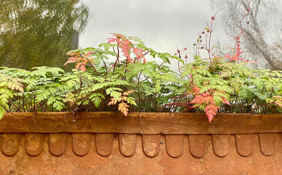 Also den Kasten im Frühjahr erstmal abgestellt irgendwo im Beet. Und dann das Wunder: er bepflanzte sich von selbst. Ruprechtskraut, der stinkende Storchschnabel, der sich eh in unseren Gärten hüben und drüben des Zauns wohlfühlt, hatte sich ausgesät und den Sommer über im Kasten breitgemacht. Also: den Kasten wieder ab auf die Fensterbank und denselbigen zum Kasten des Jahres gekürt. Denn: Er grünt noch immer. Auch jetzt Ende November. Und das fast ohne Gießen.