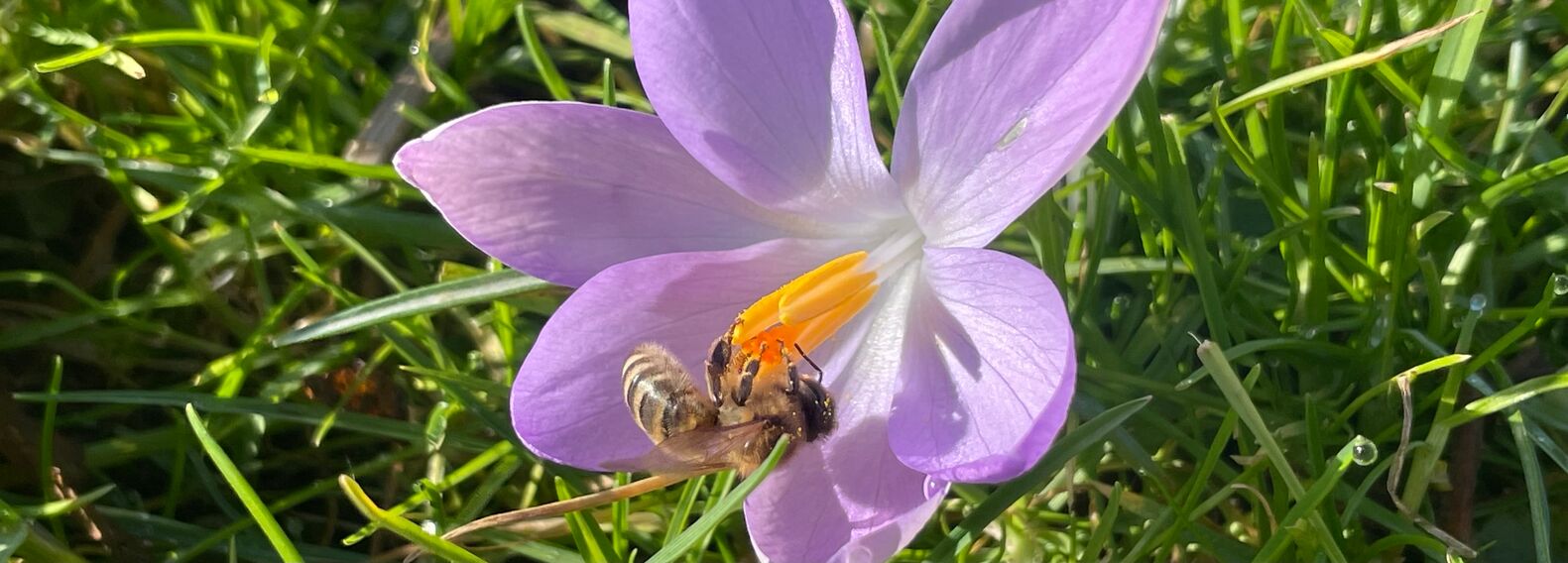 Die Krokusse sind Gott sei Dank genauso so schnell wie die Bienen: Scheint die Sonne im Februar – zack öffnen sie ihre zarten, lila Blüten. Auch bei diesen Krokussen wissen wir gar nicht, woher sie so schnell kommen. So unscheinbar strecken sie ihr zartes Grün aus der Erde, kaum von den Grashalmen zu unterscheiden. Und das in großer Zahl, denn sie sind große Künstler, sich auszubreiten. Wir nennen sie „wilde“ Krokusse, aber eigentlich sind es die Elfenkrokusse, irgendwann eingewandert, in unseren Gärten lange schon daheim.